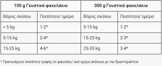 Οι μέσες ποσότητες σίτισης είναι ενδεικτικές για ενήλικους σκύλους με φυσιολογικά επίπεδα δραστηριότητας και αναφέρονται στον πίνακα. Η ιδανική ποσότητα τροφής καθορίζεται σωστά όταν ελέγχετε τακτικά το βάρος του σκύλου σας. Φρέσκο πόσιμο νερό να είναι πάντα διαθέσιμο. Μετά το άνοιγμα διατηρείται για 24 ώρες στο ψυγείο.